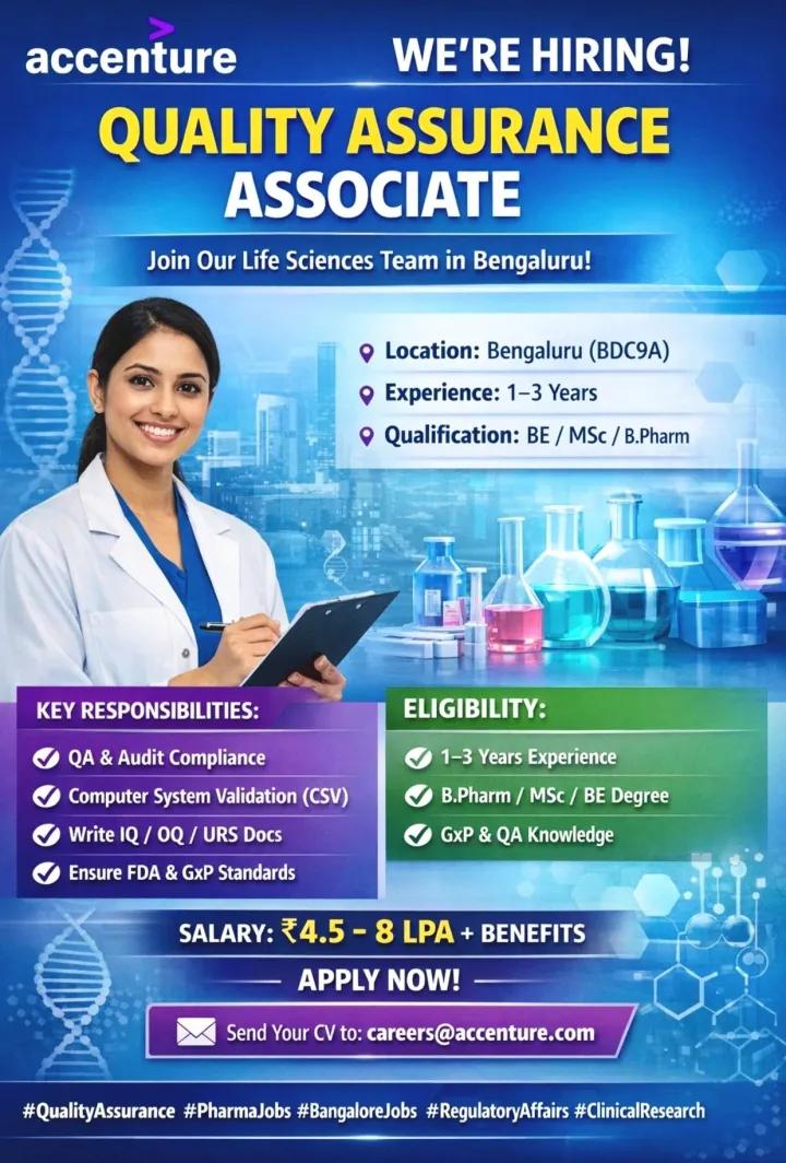 Accenture is currently seeking a detail-oriented and experienced Quality Assurance (QA) Associate to join its Life Sciences and Healthcare division in Bengaluru. This is an exceptional opportunity for professionals with 1–3 years of experience in the pharmaceutical or life sciences industry to advance their careers within a leading global consulting and technology firm. The successful candidate will play a pivotal role in ensuring regulatory compliance, performing Computer System Validation (CSV), and managing critical documentation within high-stakes, global project environments.