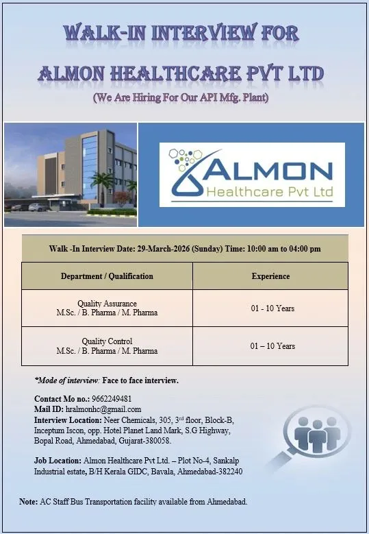 Almon Healthcare Pvt. Ltd., a premier pharmaceutical organization based in Ahmedabad, is expanding its team. We are currently seeking dedicated and skilled professionals for immediate openings in our Quality Assurance (QA) and Quality Control (QC) departments. We offer an excellent working environment, opportunities for professional growth, and convenient staff transportation facilities. We welcome applications from both experienced professionals and motivated individuals ready to contribute to our high-standard API manufacturing processes.