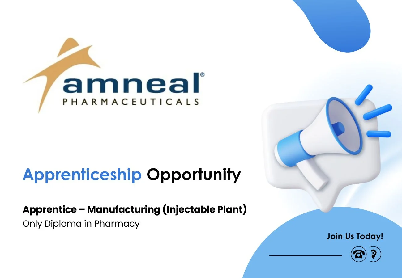 Amneal Pharmaceuticals, a leading and rapidly expanding injectable manufacturer in India, is offering an exciting Apprenticeship Program for Diploma freshers at our advanced Injectable Manufacturing Plant in Pipan, Sanand (Ahmedabad). This is a fantastic opportunity for motivated individuals to begin their career in the pharmaceutical industry, gaining practical experience and training from industry experts in a state-of-the-art facility.