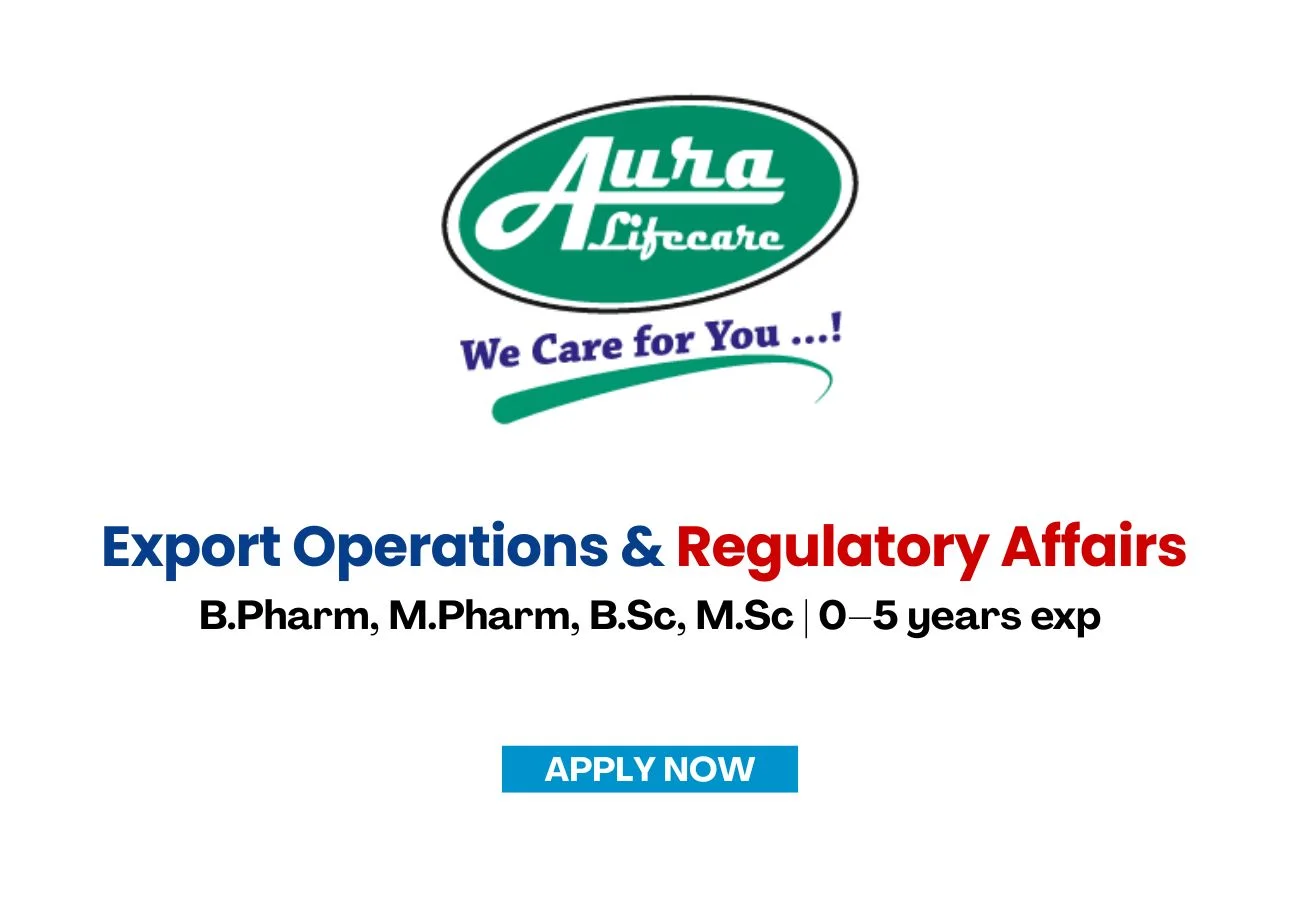 Aura Lifecare is seeking dedicated professionals to join our expanding team. We have immediate openings in our Export Operations and Regulatory Affairs departments. These roles are designed for both fresh graduates and experienced professionals who are looking to build a high-impact career within the pharmaceutical industry. Successful candidates will gain hands-on experience in global export logistics, international documentation, and complex regulatory compliance processes.