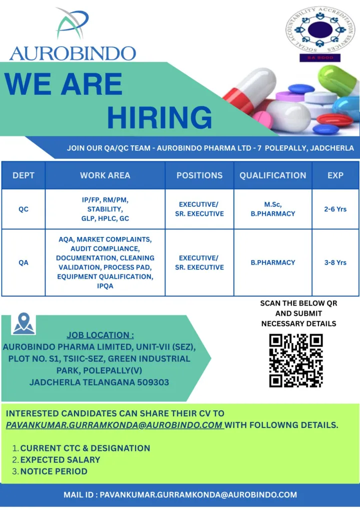 Aurobindo Pharma is hiring for the QA & QC/Engineering
