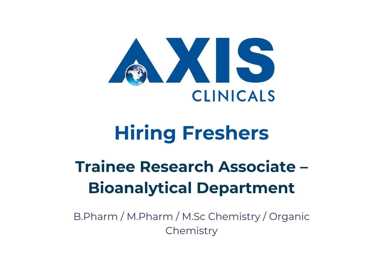 Axis Clinicals, a leading Clinical Research Organization (CRO), is seeking enthusiastic and motivated fresh graduates to join our Bioanalytical Department as Trainee Research Associates. This is a fantastic opportunity for individuals with a background in B.Pharm, M.Pharm, M.Sc Chemistry, or M.Sc Organic Chemistry to kickstart their careers in the dynamic field of bioanalytical research. If you are a recent graduate (2023-2025) with a strong work ethic and a commitment to quality, we encourage you to apply!