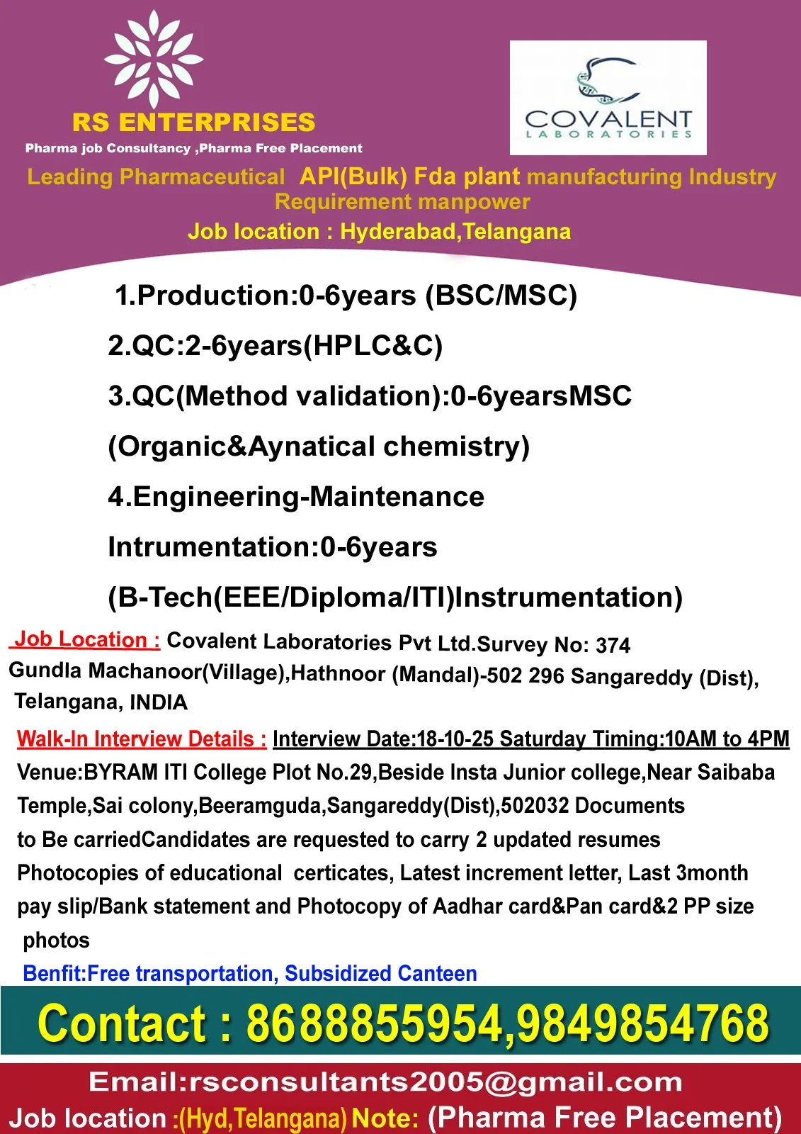 - Job Location: Covalent Laboratories Pvt. Ltd. Survey No: 374