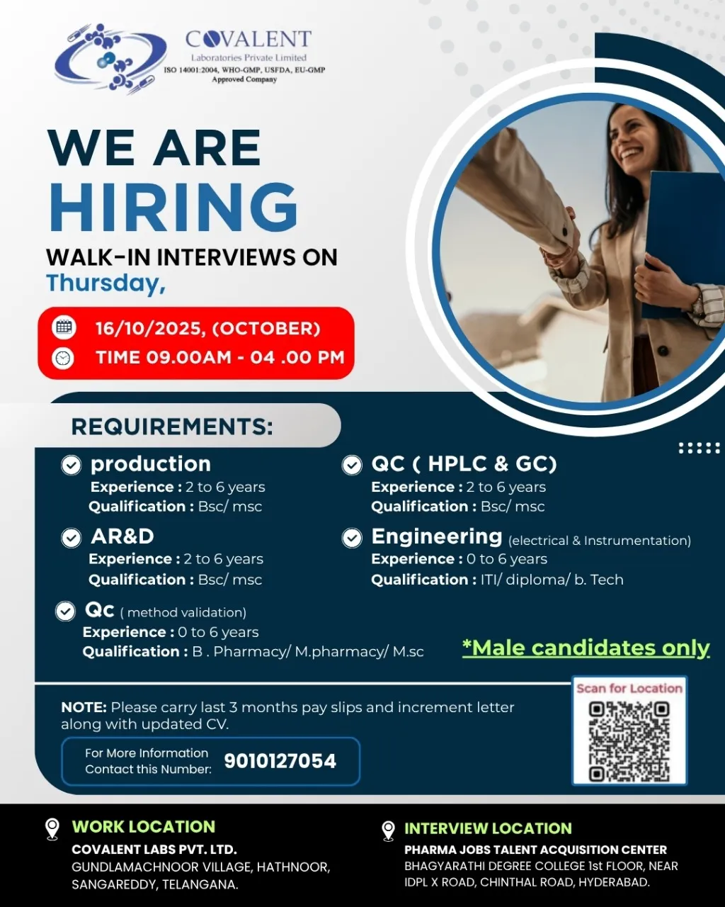 Covalent Laboratories – Walk-Ins for B.Sc, M.Sc, B.Pharm, M.Pharm, B.Tech, ITI, Diploma Freshers & Experienced on 16th Oct’ 2025
