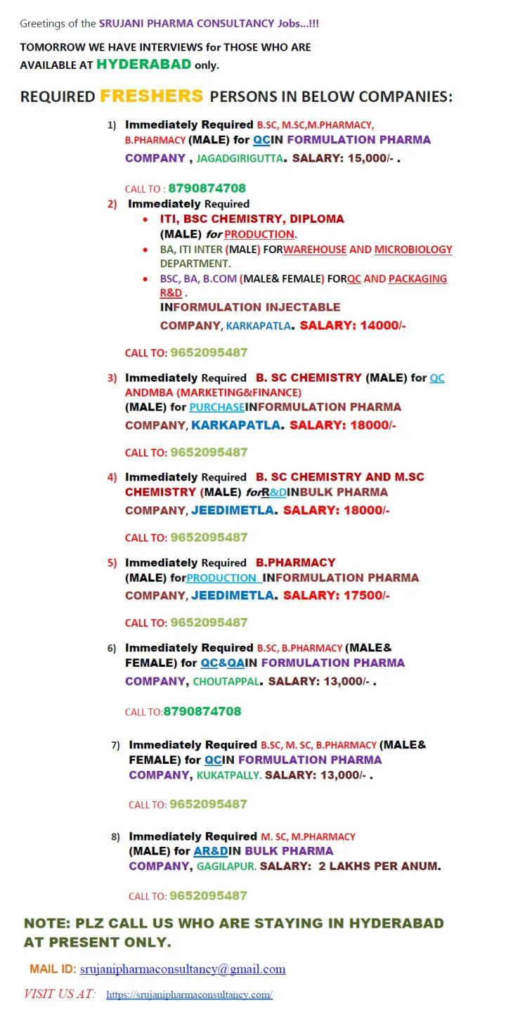 Srujani Pharma Consultancy is currently seeking motivated freshers and entry-level professionals for various urgent openings across multiple top-tier pharmaceutical companies in the Hyderabad region. We are conducting interviews for candidates currently residing in Hyderabad. If you are a graduate or post-graduate in Pharmacy, Chemistry, or relevant disciplines looking to kickstart your career in the pharmaceutical industry, we have immediate placement opportunities waiting for you.