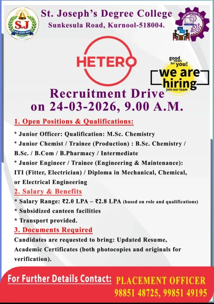 Disclaimer: Hetero is an equal opportunity employer. We maintain a professional and safe working environment for all employees. Please be wary of any fraudulent job offers that require financial deposits; this walk-in drive is conducted directly by the company and does not involve any such charges.