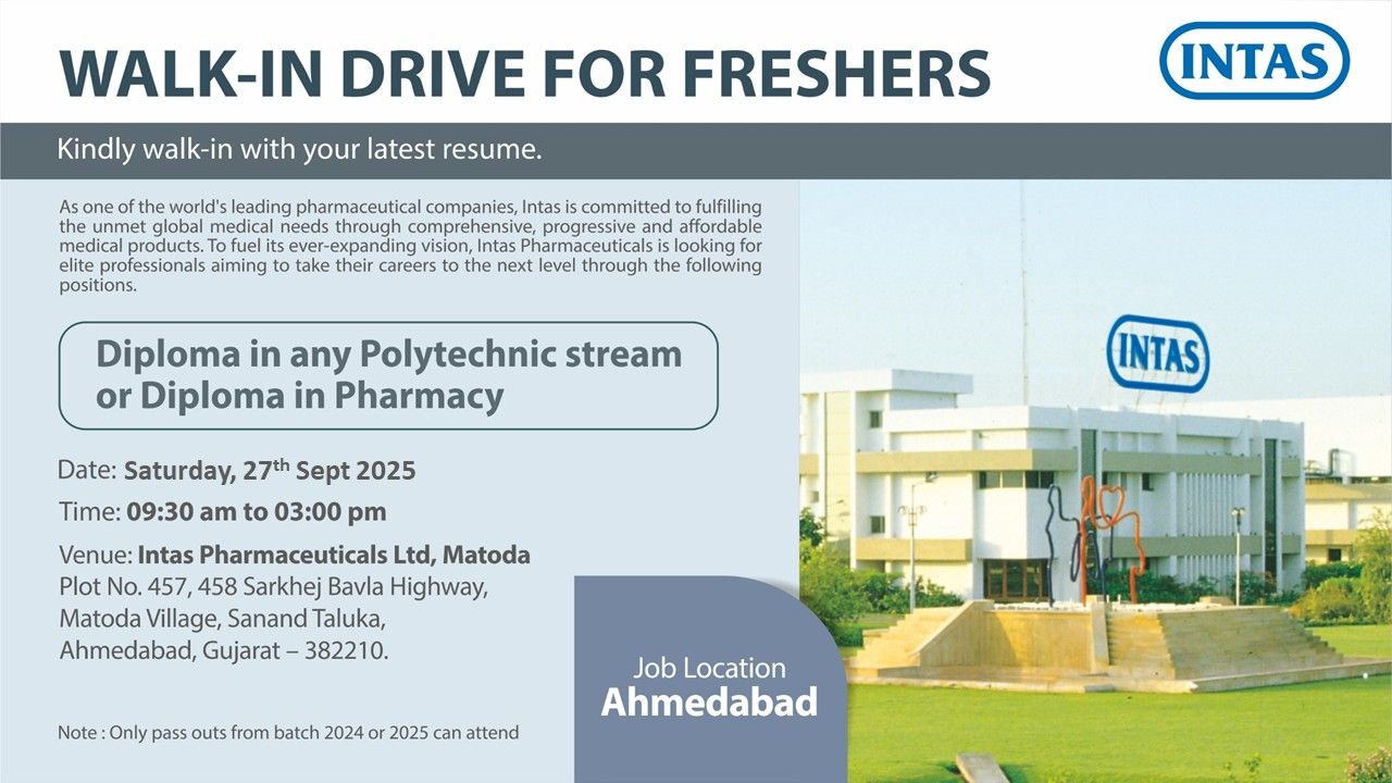 - Venue: Intas Pharmaceuticals Ltd, Matoda Plot No. 457. 458 Sarkhej Bavla Highway, Matoda Village, Sanand Taluka, Ahmedabad, Gujarat.
