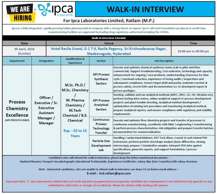 We look forward to meeting talented individuals who are interested in pursuing a rewarding career with Ipca Laboratories Limited. If you meet the qualifications and are eager to work in a challenging and innovative setting, we encourage you to attend the walk-in session on the scheduled date.