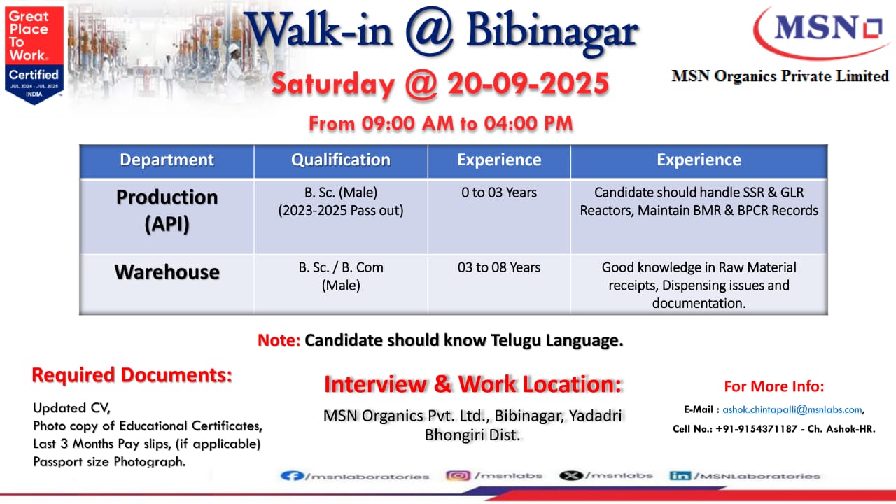 MSN Organics Pvt. Ltd., a Great Place to Work – Certified organization (2024–2025), is conducting a Walk-In Drive on 20th September 2025 at its Bibinagar facility. Exciting opportunities are available in Production (API) and Warehouse departments for qualified graduates. Join us to be part of a leading pharmaceutical company and build your career in a progressive and growth-driven environment.