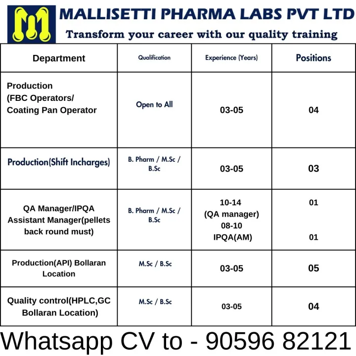 Mallisetti Pharma Labs Private Limited is currently seeking 18 highly motivated and experienced professionals to join our esteemed team in Hyderabad. We are looking for dedicated individuals across Production, Quality Control, and Quality Assurance departments. If you have 3 to 14 years of industry experience and are ready to take the next step in your career with a premier training and pharmaceutical organization, we encourage you to apply today.