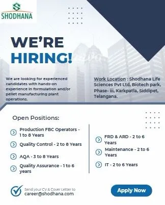 Commitment to Quality: At Shodhana Life Sciences, we prioritize talent that brings hands-on knowledge to our floor. We encourage experienced professionals from across the pharmaceutical manufacturing sector to apply and take the next step in their career journey with us.
