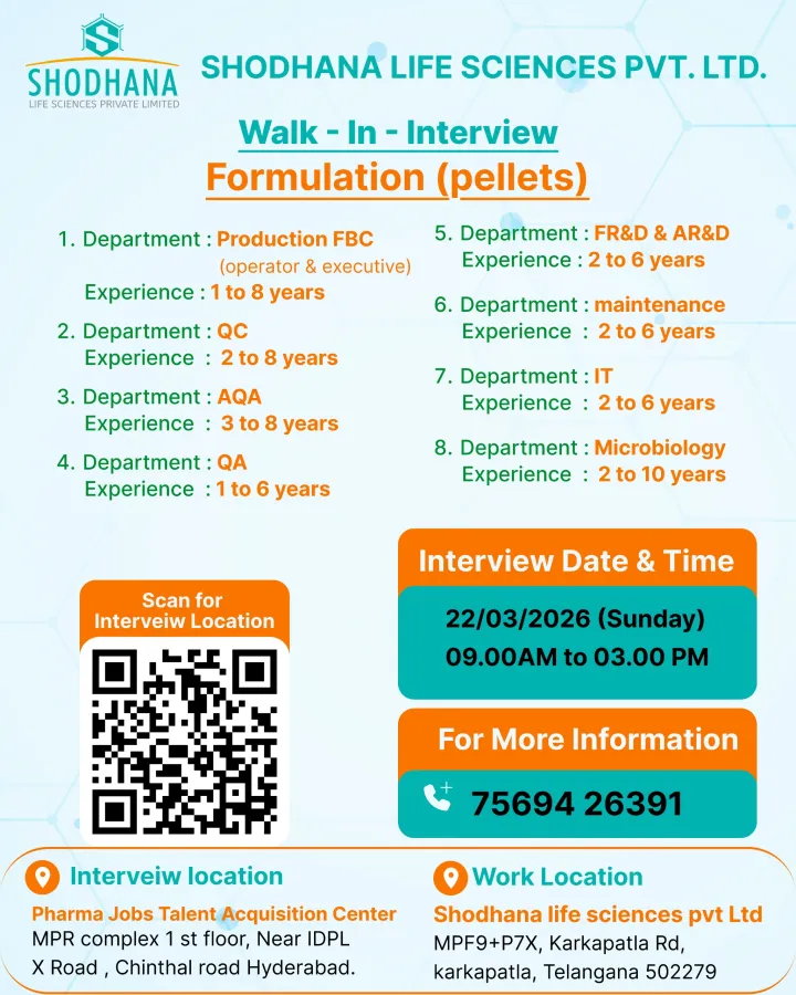Shodhana Life Sciences is an equal opportunity employer. We value talent and dedication and offer a professional environment where you can thrive and grow within the pharmaceutical sector. We look forward to meeting you at our Walk-In Interview event.