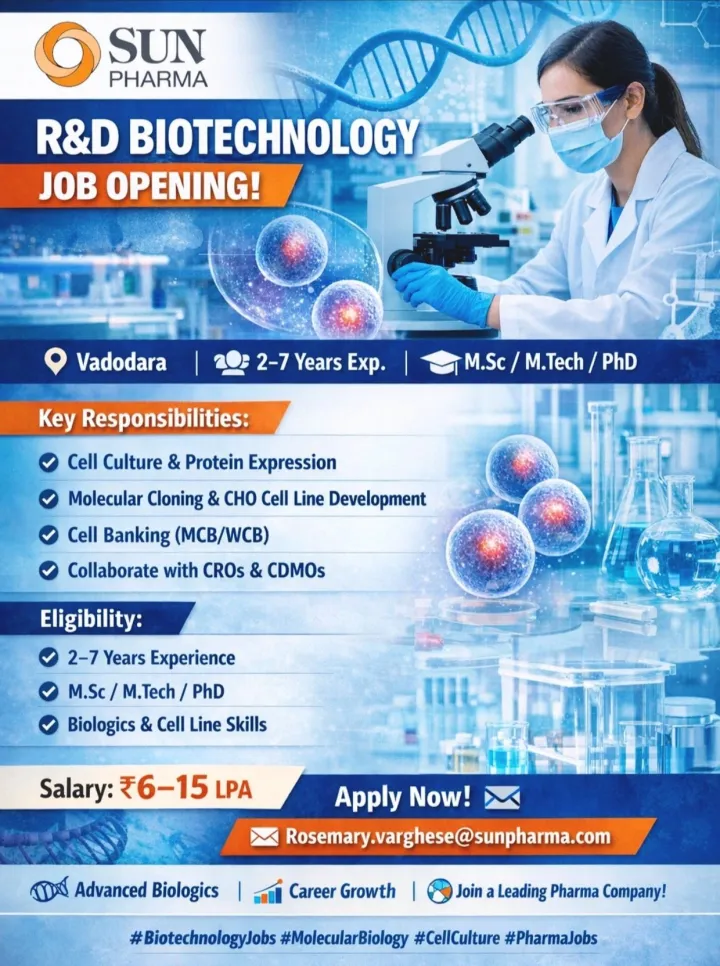 Professional Experience: We are looking for candidates with 2 to 7 years of direct, hands-on experience in the biotechnology sector. Proficiency in both molecular biology and mammalian cell culture is essential.