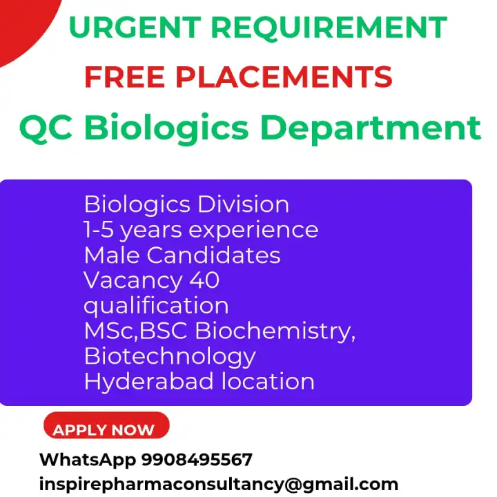Inspire Pharma Consultancy is hiring for 40 dynamic professionals for the Biologics Division at a leading API manufacturing plant in Hyderabad. We are seeking dedicated male candidates with 1 to 5 years of experience in Quality Control to join our growing team. This is a direct, face-to-face recruitment process offering free placement services for qualified candidates.