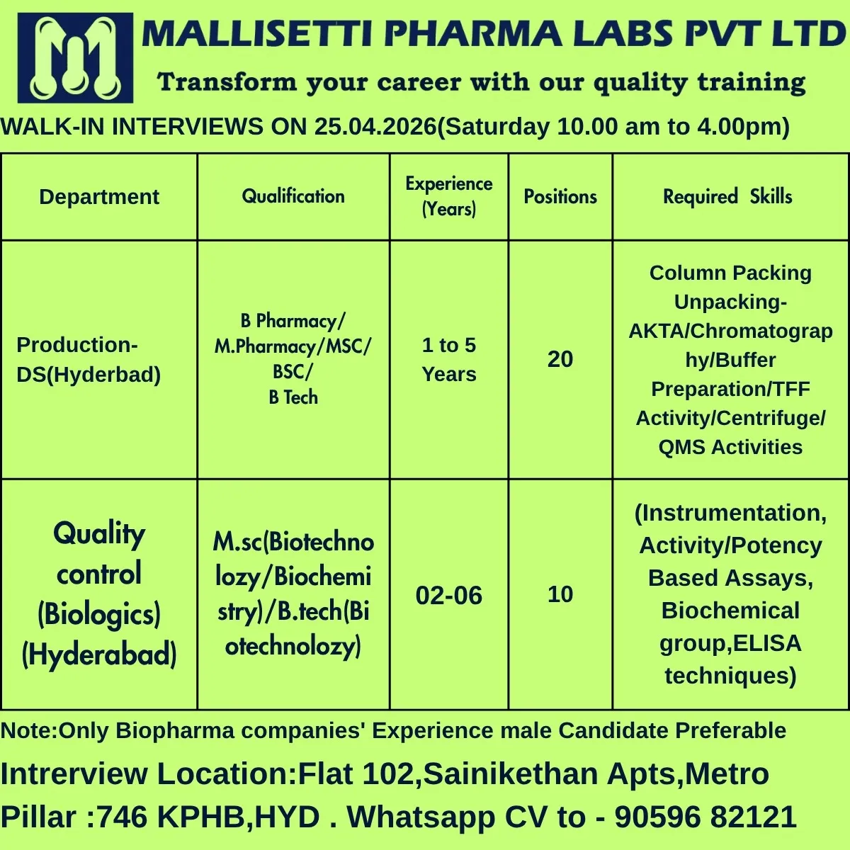Mallisetti Pharma Labs Private Limited is currently seeking 30 dedicated professionals to join our esteemed team in Hyderabad. We are looking for qualified candidates with experience in the Biopharma sector to fill critical roles within our Production and Quality Control departments. If you are a driven individual with 1 to 6 years of experience looking to advance your career with a premier training and research institution, we invite you to attend our upcoming walk-in interview event.
